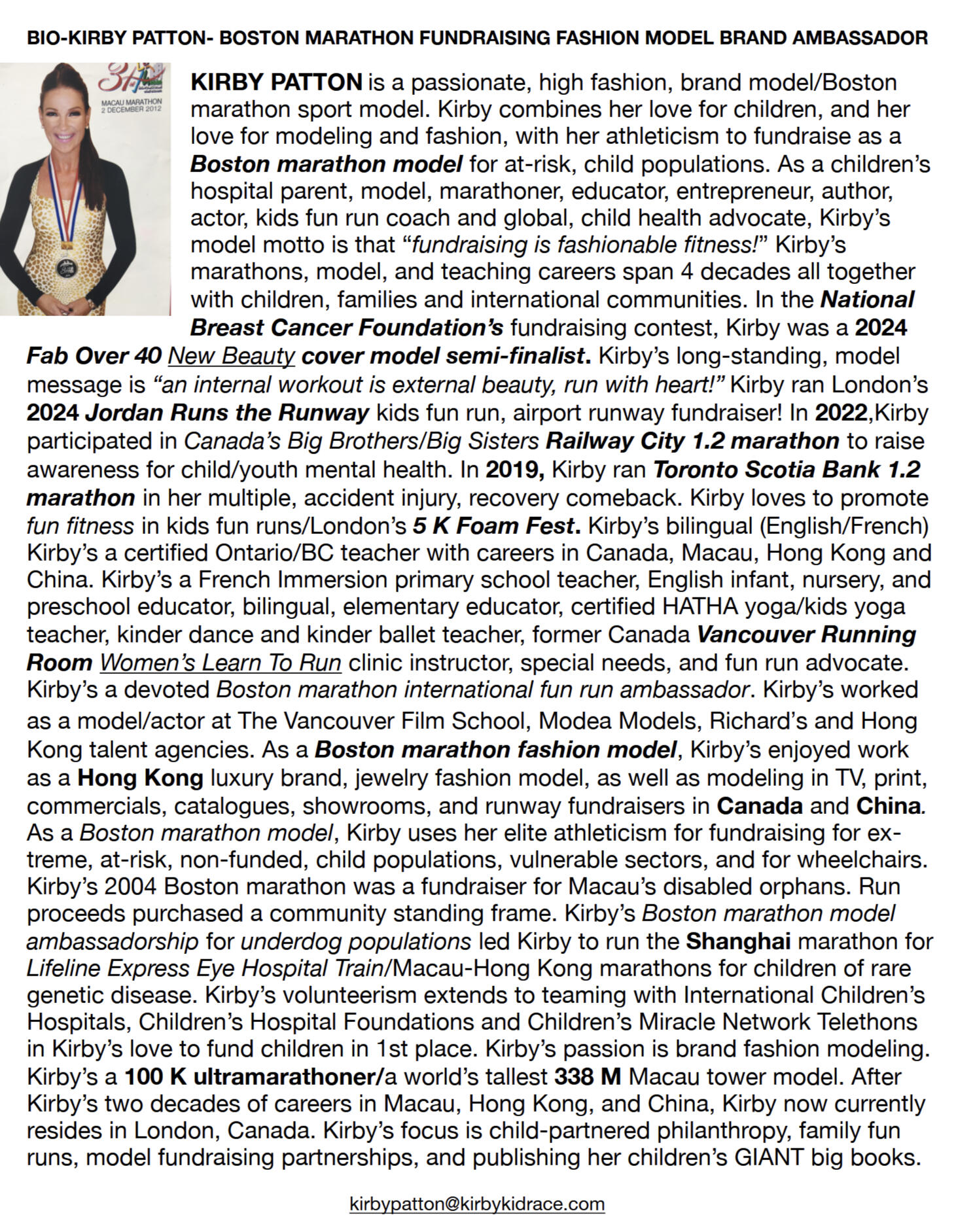 100% of proceeds from the 2025 Kirby Kid Race Mini Fun Run May Fundraising Challenge and from Canada's largest marathon's 2025 BMO Vancouver Marathon 8 km fundraising run are Kirby Kid Race funds that are donated to Children's Hospital London Health Sciences Centre's paediatric patients in Kirby Patton's hometown of London, Canada thanks to the Children's Health Foundation where Kirby volunteers.
